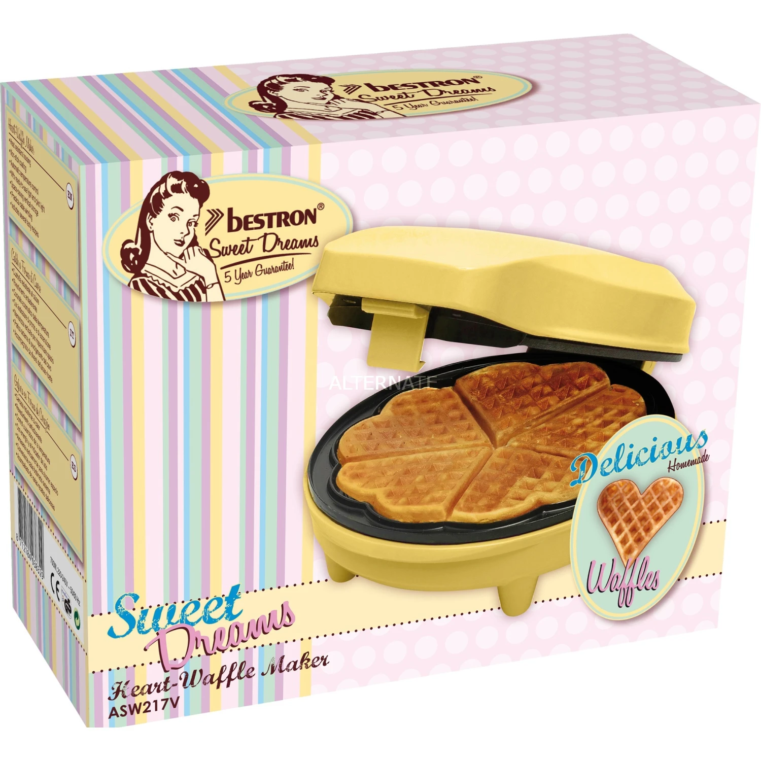 Mit dem Waffeleisen ASW217V von Bestron lassen sich herrliche Herzwaffeln zaubern. Mit der automatischen Temperaturregelung und der praktischen Kontrollleuchte für “gebrauchsfertig” und “An/Aus” sind viele Waffel-Variationen möglich. Das Gehäuse in zartem Gelb ist wärmeisoliert. Für Sicherheit sorgen die Antirutschfüße. Die Reinigung ist dank der Antihaftbeschichtung ein Kinderspiel.
