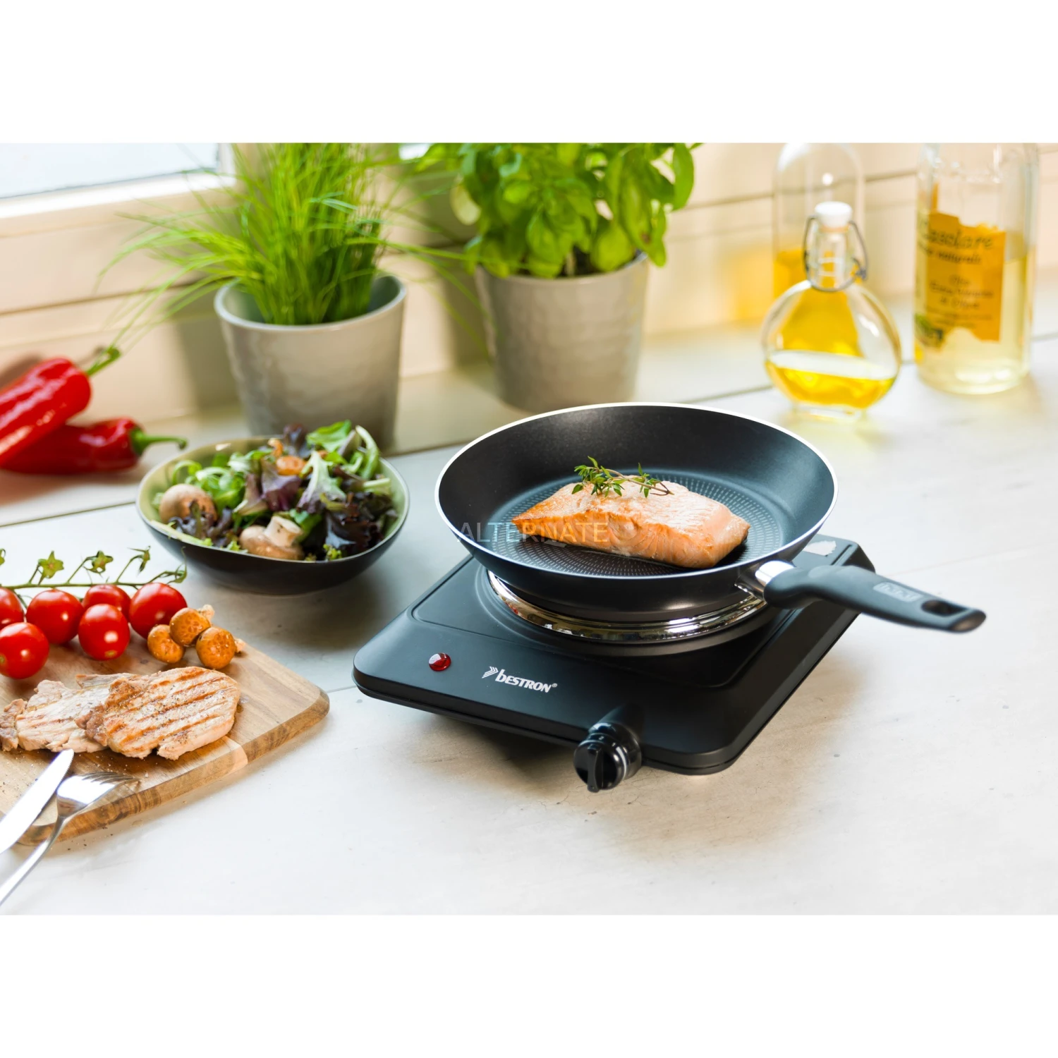 Die Einzelkochplatte AHP150 von Bestron ist mit 1500 Watt Leistung ausgestattet. Das Gehäuse ist hoch hitzebeständig lackiert. Die robuste Gusseisenplatte hat einen Durchmesser von ca. 18 cm. Durch das Thermostat kann die Temperatur stufenlos eingestellt werden. Für Sicherheit sorgen die Kontrollleuchte und die Antirutschfüße.