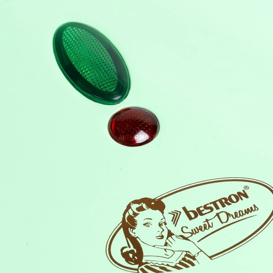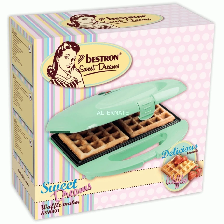 Mit dem Waffeleisen ASW401 von Bestron lassen sich zwei herrliche Brüsseler Waffeln zaubern. Das Gehäuse in frischem Hellgrün ist hoch hitzebeständig und die Griffe sind wärmeisoliert. Für noch mehr Sicherheit sorgen die Antirutschfüße. Die Reinigung ist dank der Antihaftbeschichtung ein Kinderspiel.