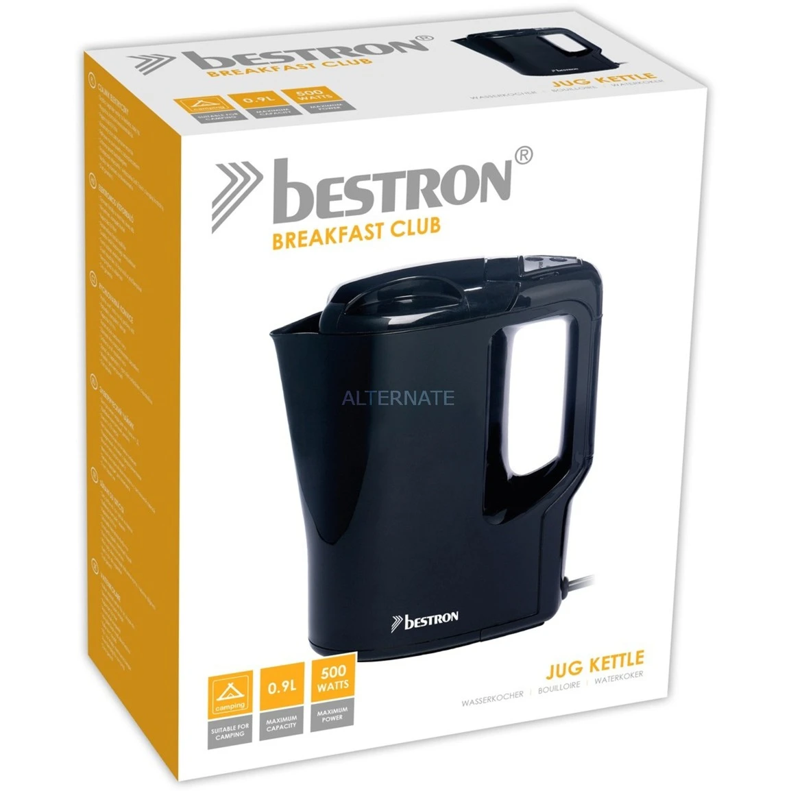 Der Wasserkocher AWK810 von Bestron überzeugt durch seine kompakte Bauweise und eignet sich so auch für Camping. Er fasst bis zu 0,9 Liter Wasser und bringt es mit einer Leistung von 500 Watt zum Kochen. Die Bedienung ist durch den Soft-Touch Ein-/Ausschalter mit Kontrollleuchte einfach. Dank integrierter Kochstoppautomatik, Trockengehschutz und Sicherheitsverschluss im Deckel ist der Wasserkocher AWK810 auch in Bezug auf Sicherheit eine gute Wahl.
