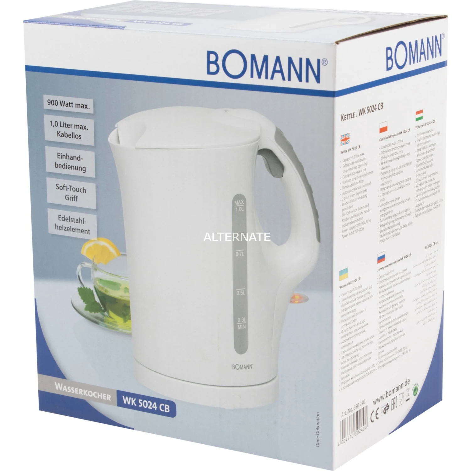 Mit einer Leistung von 900 W bringt der WK 5024 von Bomann das eingefüllte Wasser schnell und effizient zum Kochen, dabei liegt die maximale Füllmenge bei 1 Liter. Der Sicherheits-Klappdeckel kann mit einer Hand geöffnet und befüllt werden, dabei lässt sich die Füllmenge über die außenliegende Anzeige einsehen. Zur besseren Reinigung ist der Kalkfilter herausnehmbar. Für eine hohe Sicherheit sorgen der Trockengeh- und Überhitzungsschutz sowie ein rutschfester, gummierter Griff.