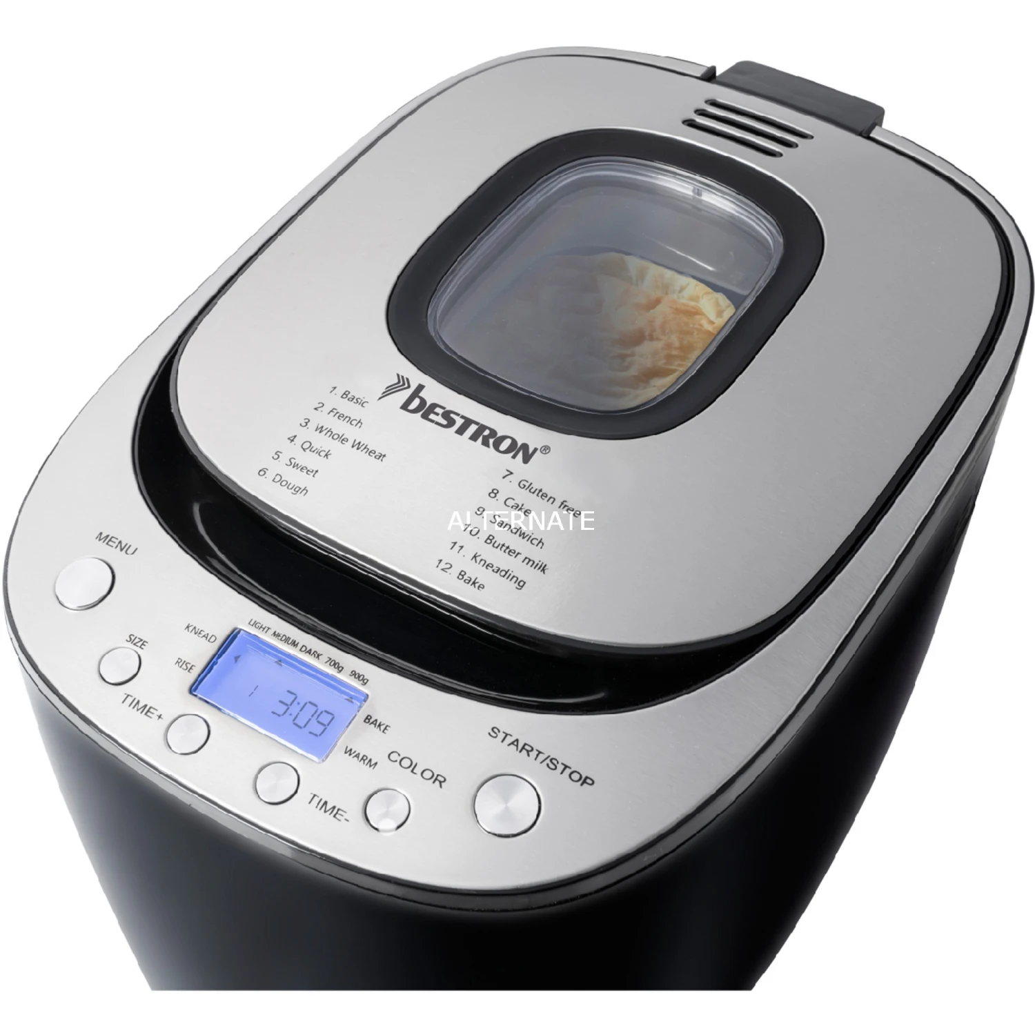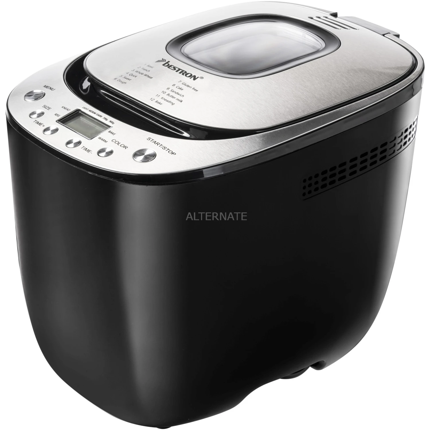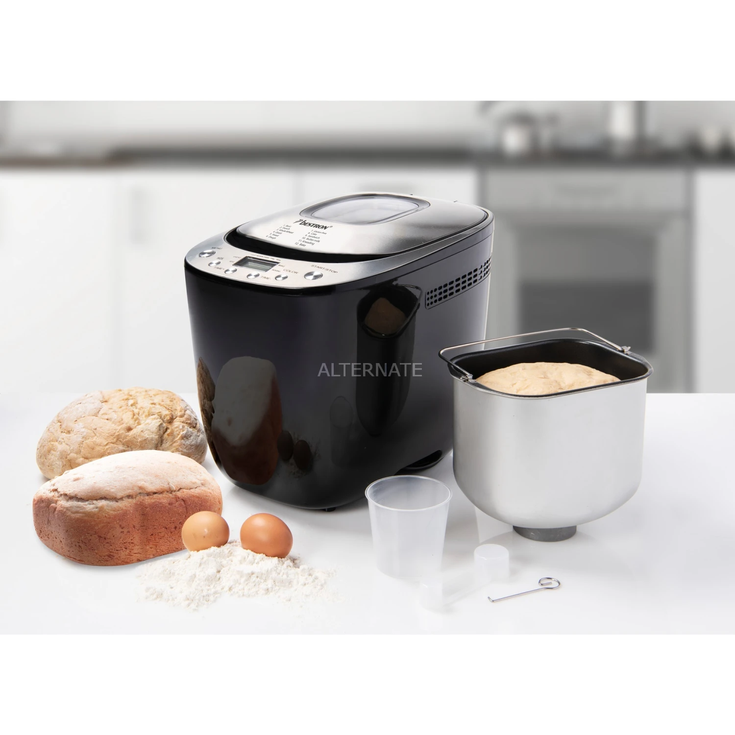 Der ABM3000B von Bestron ist ein vollautomatischer Brotbackautomat, mit dem sich verschiedene Teige und Brote bis zu 900 g zubereiten lassen. Es stehen 12 digitale Backprogramme für verschiedene Teig- und Brotsorten wie Weiß-, Vollkorn- und Dinkelbrot oder Pizza- und Kuchenteig, usw. sowie eine Bräunungskontrolle für helle, mittlere oder dunkle Krusten zur Auswahl. Der ABM3000B eignet sich auch ideal für glutenfreie oder kohlenhydratfreie Teige. Mit Hilfe des beleuchteten LCD-Displays und einfacher Tasten lassen sich alle Einstellungen vornehmen. Dazu ist der Brotbackautomat mit einer Schnellbackfunktion, einem praktischen 13-Stunden-Timer und einer Warmhaltefunktion (60 Min.) ausgestattet. So kann man den Brotbackautomaten abends einstellen und am nächsten Morgen mit dem Geruch von frisch gebackenem Brot aufwachen. Für eine einfache Reinigung ist die herausnehmbare Backform antihaftbeschichtet und spülmaschinenfest. Im Lieferumfang sind ein Messbecher und Dosierlöffel enthalten.