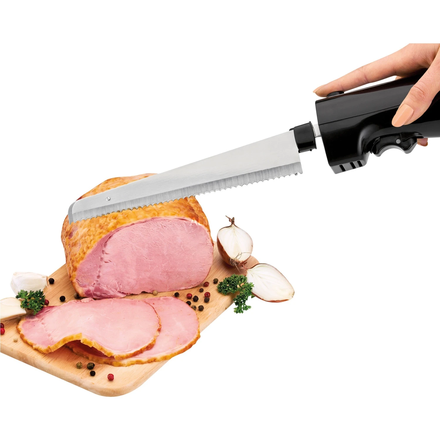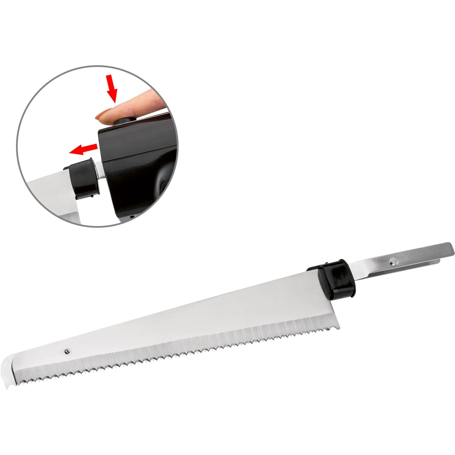 Schneiden ohne Kraftaufwand – mit dem Elektromesser EM 3702 von Clatronic. Das leistungsstarke Elektromesser EM 3702 von Clatronic ist ideal für den täglichen Gebrauch. Mit dem EM 3702 lassen sich Brot, Braten, Torten oder auch gefrorene Lebensmittel ganz nach den jeweiligen Bedürfnissen schneiden. Die hochwertige Edelstahleinlage verleiht dem EM 3702 ein edles und stilvolles Aussehen. Die spezialgezahnte Edelstahl-Mehrzweckklinge schneidet jegliche Lebensmittel präzise und problemlos – von Brot, Fleisch bis hin zu Gefriergut. Per Knopfdruck lässt sich die Klinge vom Gerät lösen. Dank integriertem Sicherheitssystem inkl. Sicherheitsschalter schneidet man nur das, was geschnitten werden soll. Nach dem Gebrauch kann die Klinge schnell in der Spülmaschine gereinigt werden. In der mitgelieferten Aufbewahrungbox können das Gerät dann einfach verstaut werden, so ist die Klinge geschützt und sicher verpackt.