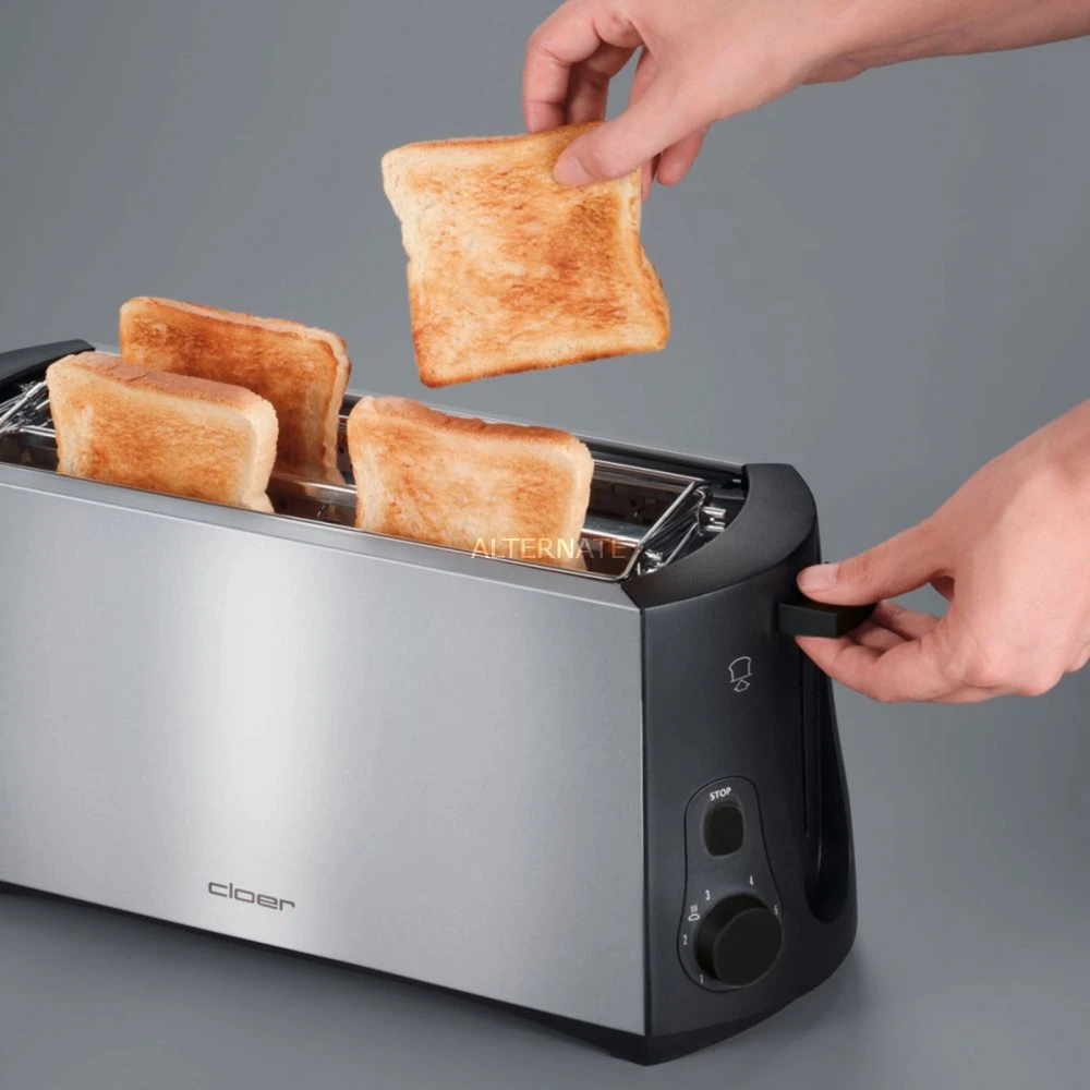 In dem Langschlitz-Toaster 3719 von Cloer finden vier Toastscheiben ihren Platz und durch das elegante Design fügt er sich in jede Küche ein. Der stufenlos einstellbare Bräunungsgrad ermöglicht individuelle Einstellungen und die Lift-Funktion hilft beim einfachen Entnehmen der Toastscheiben. Für optimale Röstergebnisse sorgen die Sensorelektronik und die Brotscheibenzentrierung. Dank des abnehmbaren Brötchenröstaufsatzes kann man sein Frühstück außerdem um aufgewärmte Croissants oder Brötchen erweitern. Die Stopptaste und die Sicherheitsabschaltung, wenn sich der Toast verklemmen sollte, sorgen für die nötige Sicherheit. Die Krümelschublade des 3719 lässt sich zur einfachen Reinigung komplett entnehmen.