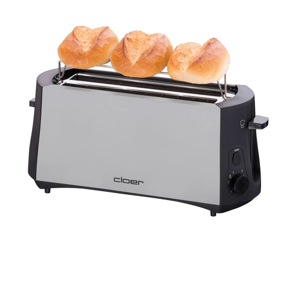 Mit dem Toaster Cloer 3710 lassen sich vier Toastscheiben gleichzeitig toasten. Mit der stufenlos einstellbaren Röstgradkontrolle lässt sich der gewünschte Bräunungsgrad einstellen. Die automatische Brotzentrierung und die Sensorelektronik sorgen für ein optimales Röstergebnis. Praktisch ist zudem die Nachhebevorrichtung sowie der integrierte Brötchenaufsatz. Die herausnehmbare Krümelschublade vereinfacht zudem die Reinigung, und die automatische Sicherheitsabschaltung, wenn sich der Toast verklemmt, machen die Bedienung des Toaster 3710 nicht nur einfach, sondern auch sicher.