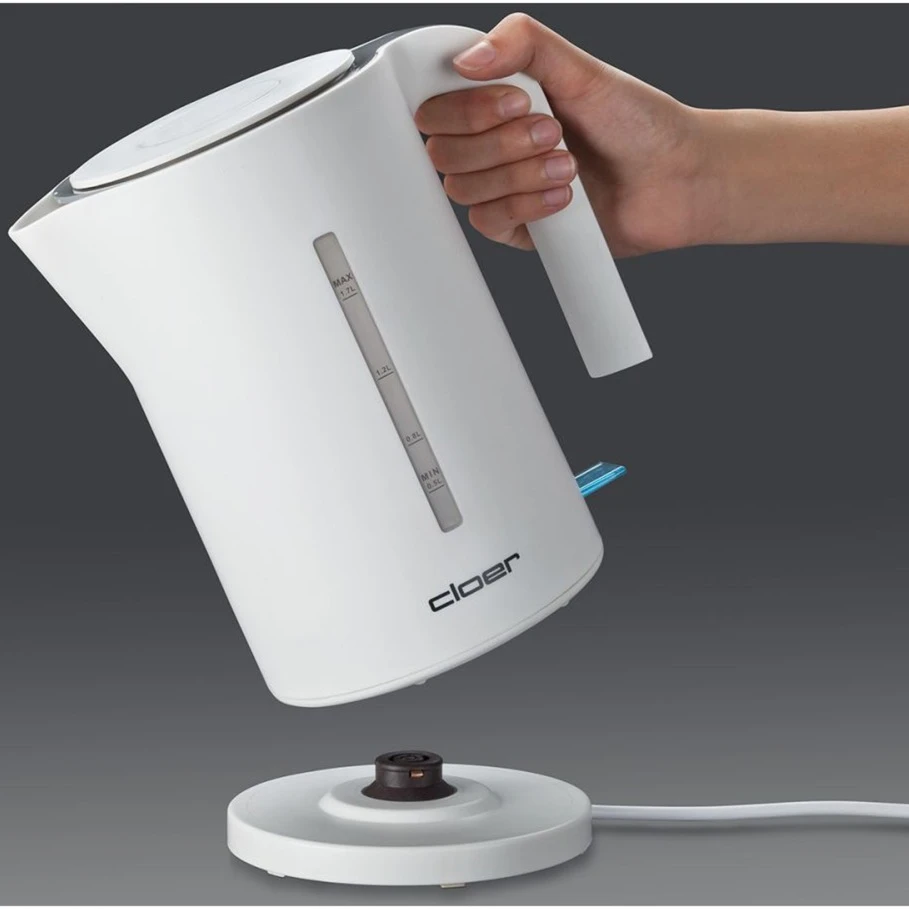 Der Wasserkocher Cloer 4111 kann bis zu 1,7 Liter Wasser aufnehmen und mit einer Leistung von bis zu 2.200 Watt in kürzester Zeit erhitzen. Das Gerät schaltet automatisch nach Beendigung des Kochvorgangs ab. Der verriegelte Sicherheitsdeckel öffnet bei Tastendruck. Praktisch ist zudem der Überhitzungs- und Trockengehschutz. Dank des 360-Grad-Anschluss-Sockel kann der Cloer 4111 in jeder Position aufgestellt und in Betrieb genommen werden.