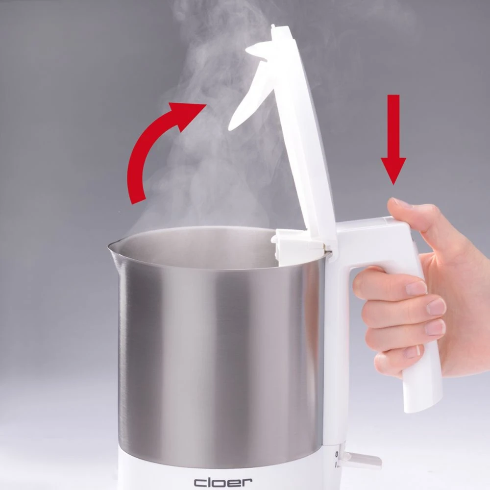 Der Wasserkocher Cloer 4701 in mattiertem Edelstahlgehäuse kann bis zu 1,5 Liter Wasser aufnehmen und mit einer Leistung von bis zu 1.800 Watt in kürzester Zeit erhitzen. Das Gerät schaltet automatisch nach Beendigung des Kochvorgangs ab. Der verriegelte Sicherheitsdeckel öffnet bei Tastendruck. Praktisch ist zudem der Überhitzungs- und Trockengehschutz. Dank des 360-Grad-Anschluss-Sockel kann der Cloer 4701 in jeder Position aufgestellt und in Betrieb genommen werden.