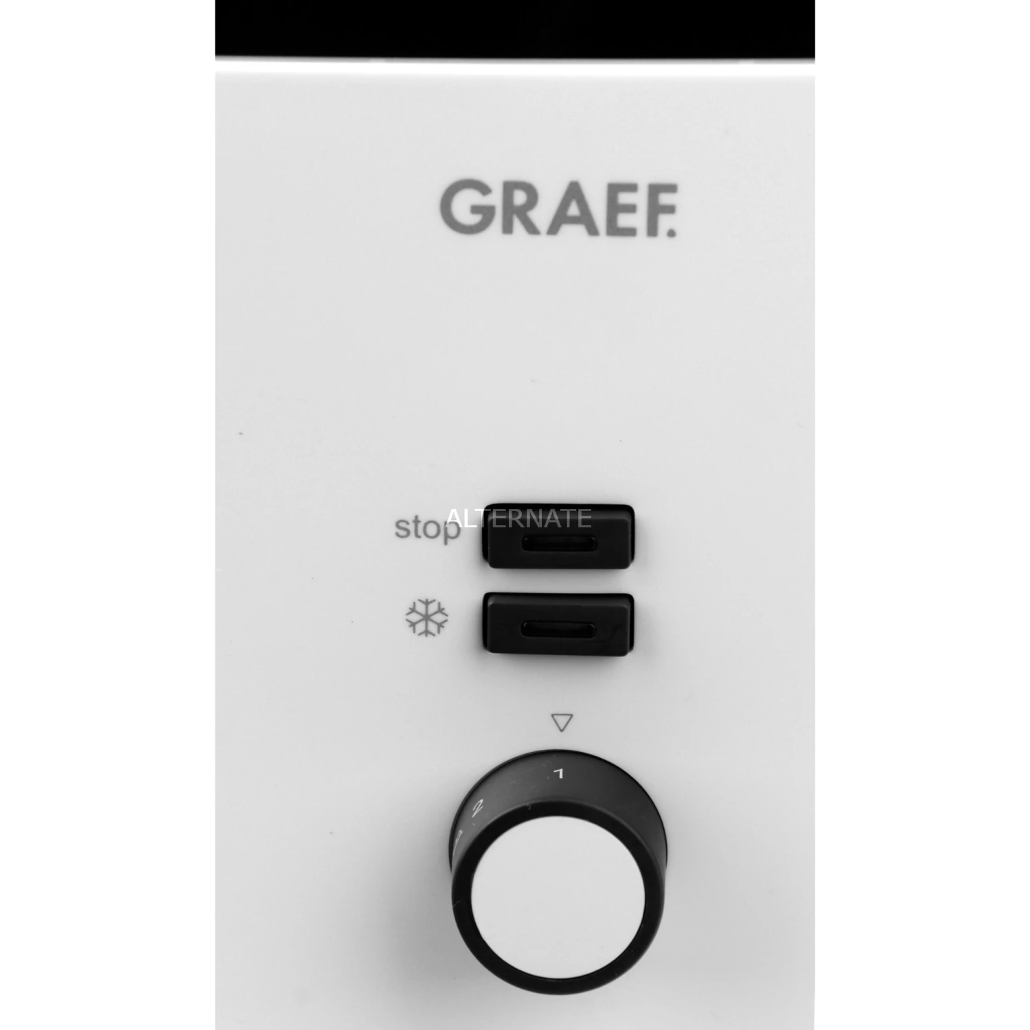 Der Toaster Graef TO 61 ist im klassischen Stil gehalten, mit weiß lackierten Seitenteilen und Chromakzenten. Der TO 61 bietet für zwei Toastscheiben mit je einem Schlitz á 110 mm idealen Platz. Die übersichtlich angeordneten Funktionstasten, einem Drehregler für variable Bräunungsstufen und eine spezielle Nachhebevorrichtung zum einfachen und sicheren Entnehmen kleiner Brotscheiben machen die Bedienung des TO 61 für den Anwender besonders einfach.