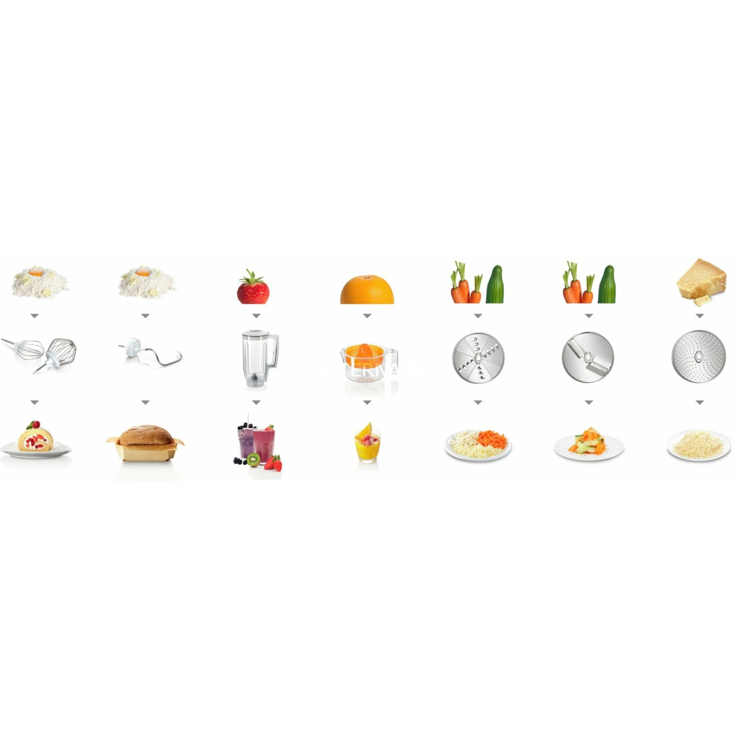 | Verwendung | Aufschlagen, Rühren, Kneten, Mixen, Raspeln, Reiben, Schnitzeln |