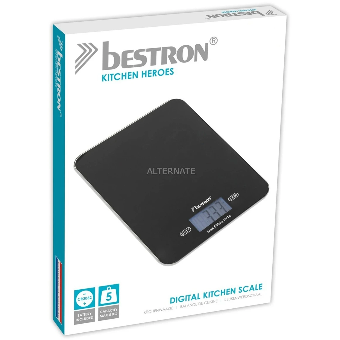 Die digitale Küchenwaage AKS710Z von Bestron ist eine batteriebetriebene Waage mit einer Wiegefläche von schwarzem Glas. Die LCD-Anzeige ist gut lesbar und verfügt über eine Batteriestands- und Überlastungsanzeige. Diese Küchenwaage zeigt das Gewicht von 1 g bis zu ihrer maximalen Tragkraft von 5 kg an, ist umschaltbar von g, oz und lb und verfügt auch über eine praktische Tara/ Zuwiegefunktion sowie über eine Abschaltautomatik.