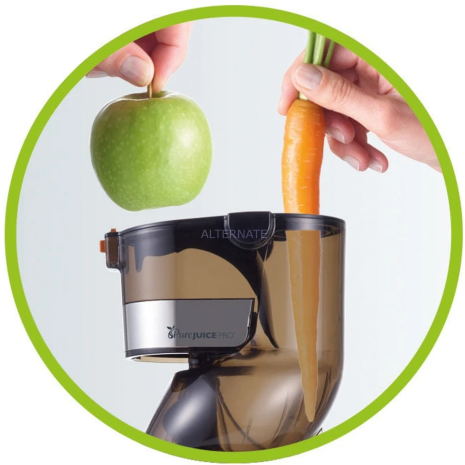 Der neue PureJuice Pro™ sorgt dafür, dass nur das Beste der Frucht im Glas landet – für ein Maximum an Frucht und Frische. Frische Säfte aus dem Slow Juicer zeichnen sich aber nicht nur durch den 100% Fruchtgehalt aus, der Saft setzt sich auch nicht so schnell ab, das Mark und der Saft bleiben eins. Der 240 Watt-Motor des Slow Juicers arbeitet mit bewusst niedriger Drehzahl. So bildet sich keine Wärme. Das verhindert die Oxidation, so dass mehr Vitamine, Enzyme und Mineralstoffe im Saft erhalten bleiben. Es können große Saftmengen direkt ohne Pause verarbeitet werden. Dank XXL-Einfüllöffnung kann mit dem PureJuice Pro™ auch ganzes Obst und Gemüse schnell und einfach entsaftet werden, ohne vorher in kleine Stücke geschnitten zu werden. Mit dem praktischen Sieb oberhalb des Saftbehälters können noch cremigere und feinere Säfte zaubert werden. Der Trester wird in einem separaten Behälter aufgefangen und eignet sich hervorragend zur Weiterverarbeitung in Kuchen, Brownies, Falafel oder als Zugabe zu Suppen und Dipps. Der PureJuice Pro™ ist leise im Betrieb und dank der praktischen Reinigungsfunktion kinderleicht zu reinigen und spülmaschinengeeignet. Aufgrund der schmalen Abmessungen findet der Slow Juicer auch in jeder noch so kleinen Küche seinen Platz – für eine gesunde Ernährung, die Spaß macht.