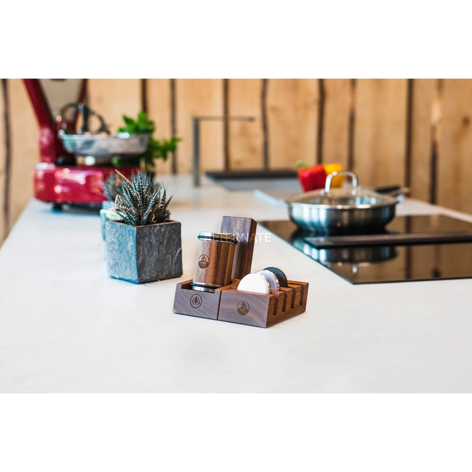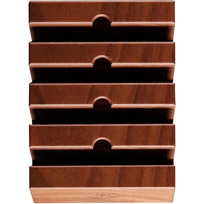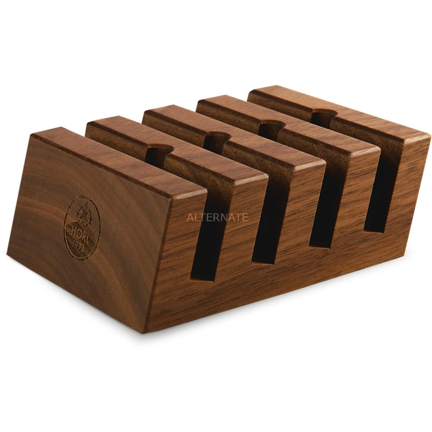 Die Schleifscheiben Station von HORL ist eine Aufbewahrungsstation für max. vier HORL Rollschleifer-Schleifscheiben. Sie wird aus einem massiven Block Nussbaum im Schwarzwald gefertigt. Die feinen Fasen veredeln die exklusive Optik. So sind die benötigten Schleifscheiben immer griffbereit und ein Blickfang in jeder Küche.
