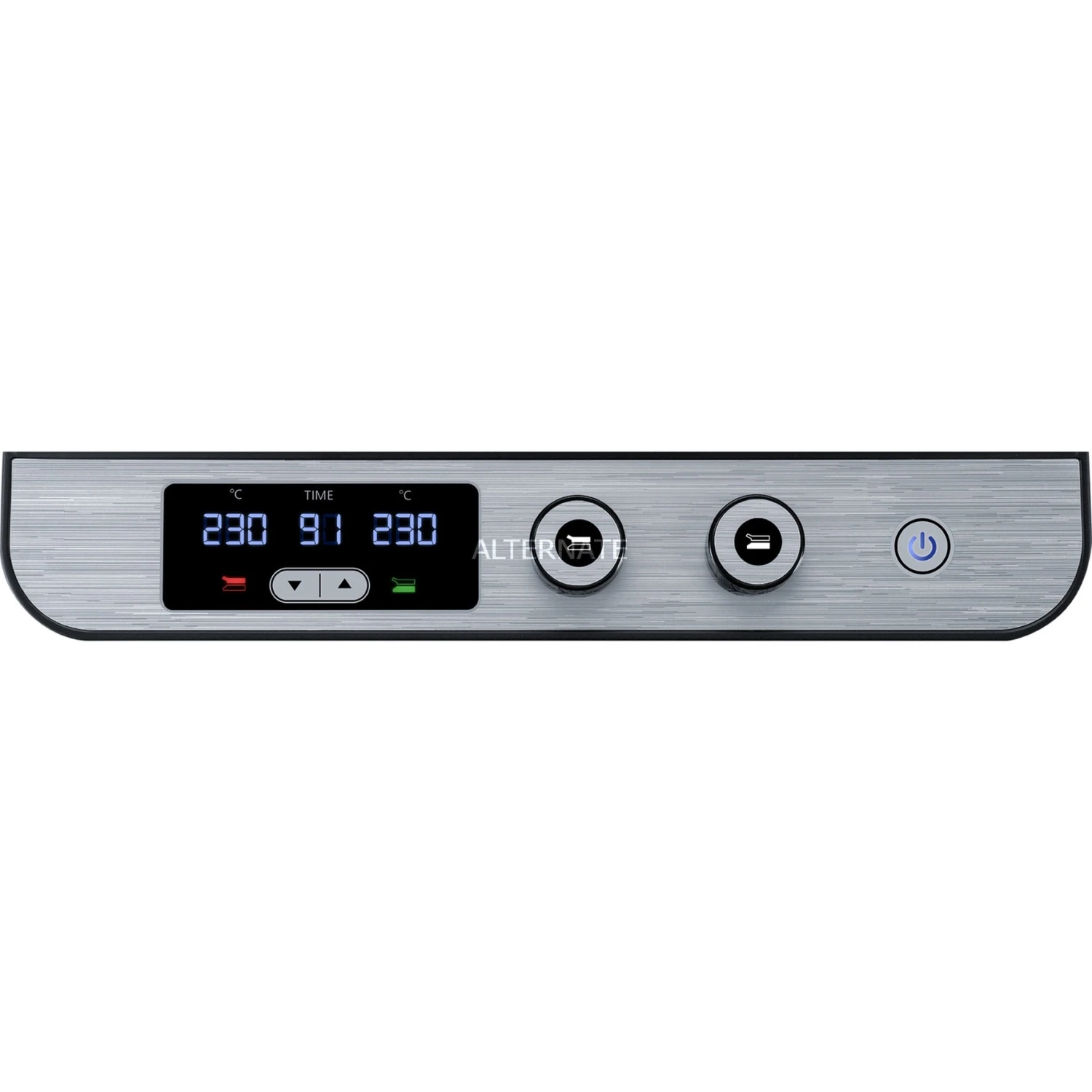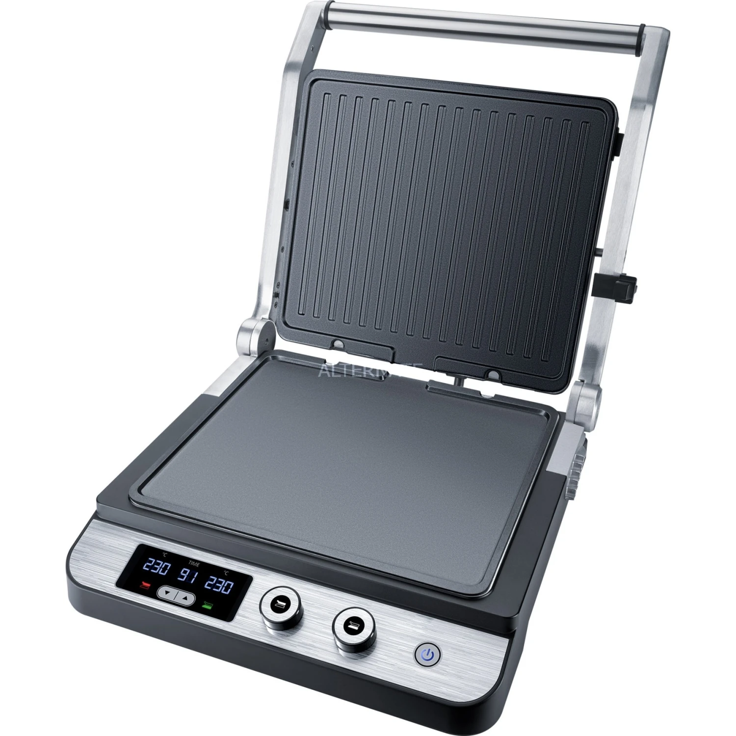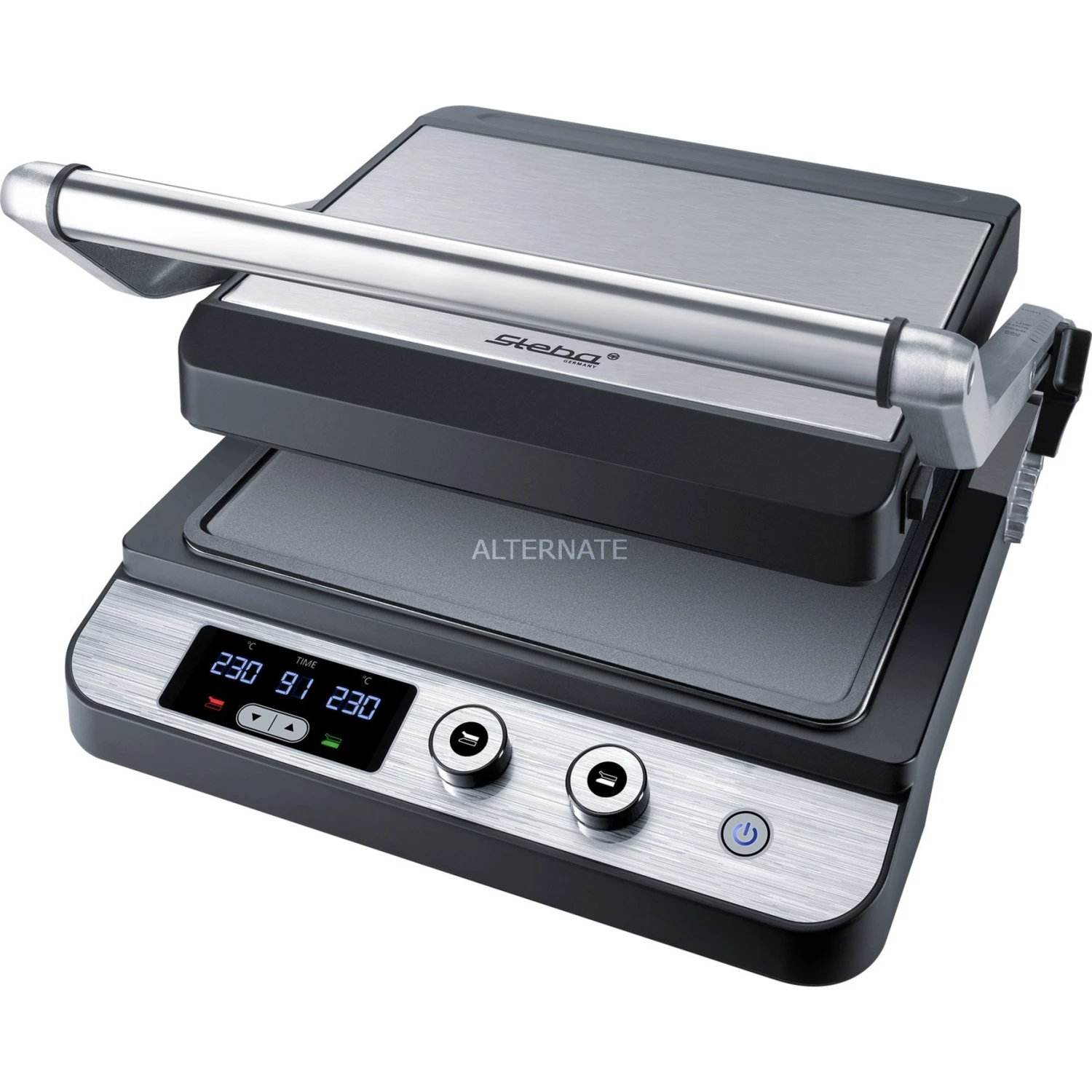 Der Steba Kontaktgrill FG 120 mit ansprechendem Edelstahlgehäuse ist vielseitig einsetzbar. Er eignet sich zum Kontaktgrillen, dank der verstellbaren Höhe auch zum Überbacken, und zum offen Grillen aufgeklappt auf doppelter Fläche. Die Temperaturen lassen sich für die obere und die untere Grillplatte individuell bis 230°C regeln. Die beiden großen antihaftbeschichteten Grillflächen messen 27 x 24cm, und bestehen aus einer glatten und einer geriffelten Grillfläche. Außerdem verfügt der Kontaktgrill FG 120 über ein LED-Display für Temperatur und Timer, und herausnehmbare Grillplatten zur leichten Reinigung.